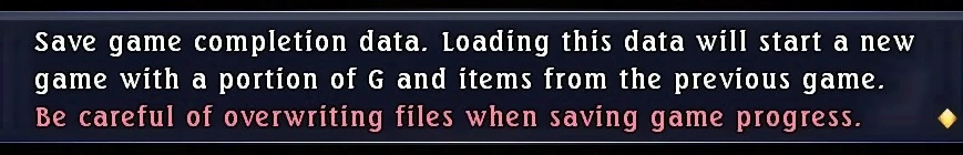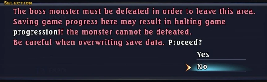 - A warning message is now displayed if you attempt to save your game in an area which you cannot leave until you defeat a boss.